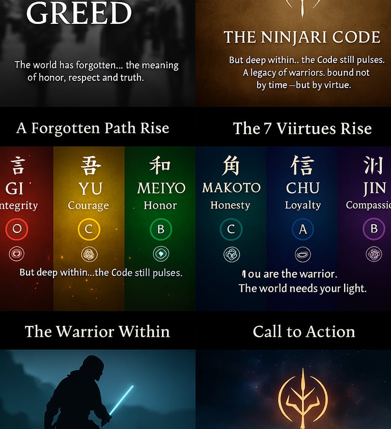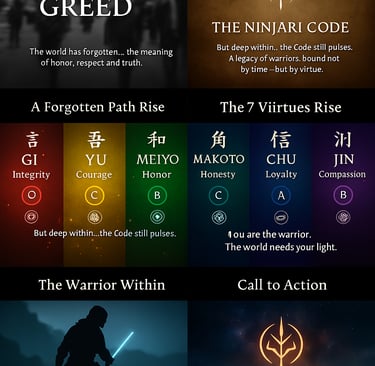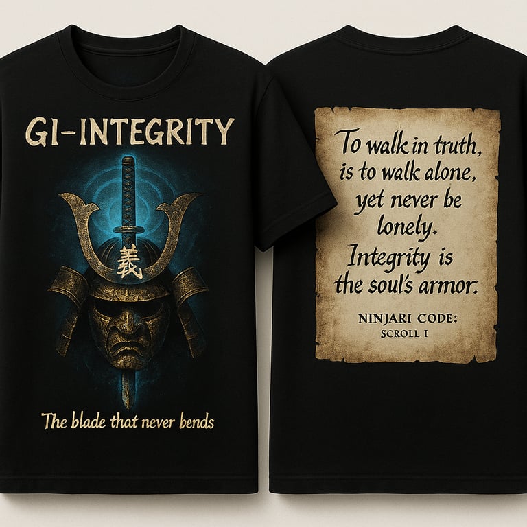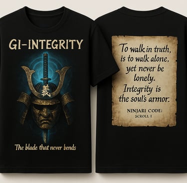 Explore our unique collection of 7 virtue t-shirts and Ninjari scrolls, designed to inspire peace and strength on your spiritual journey.
